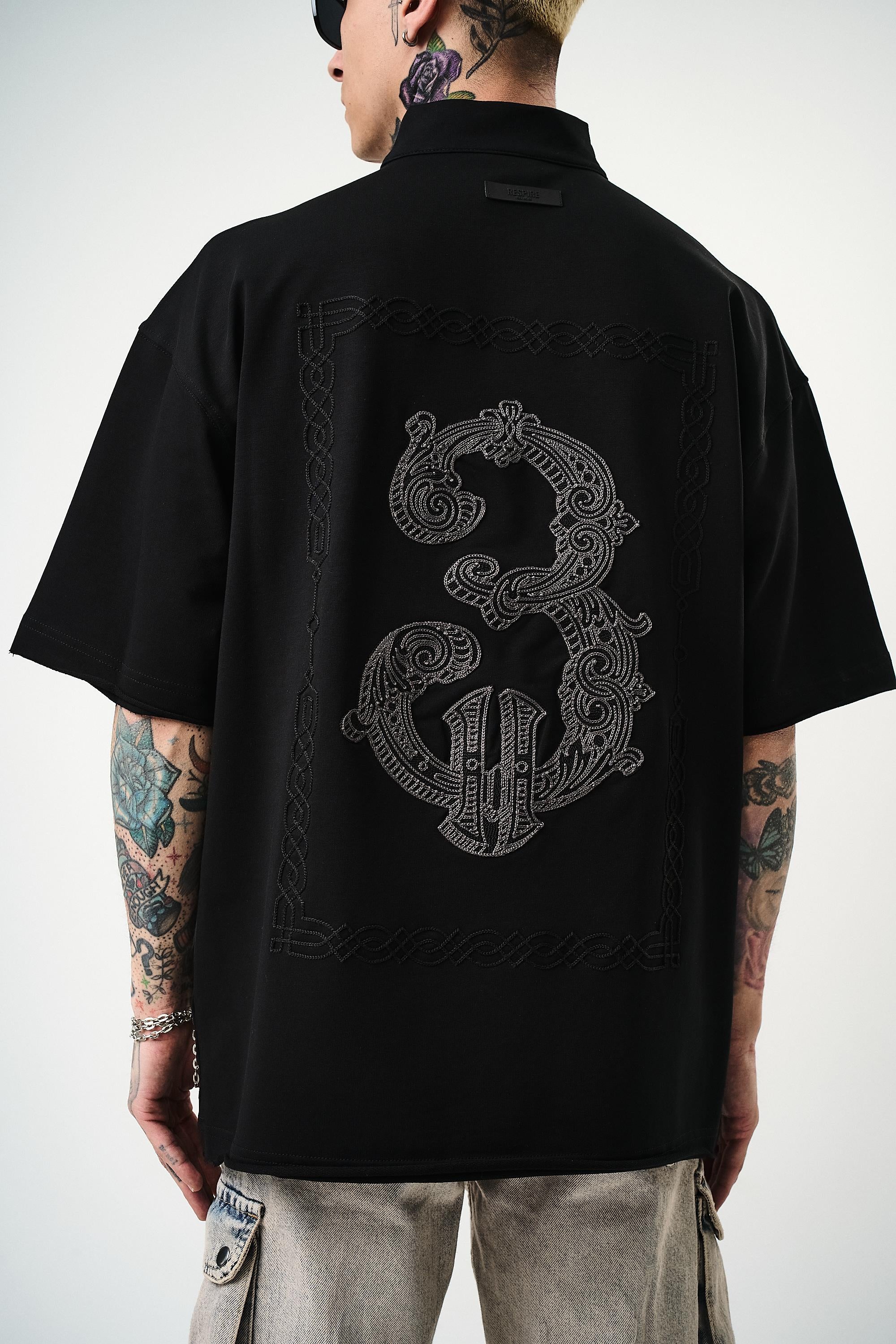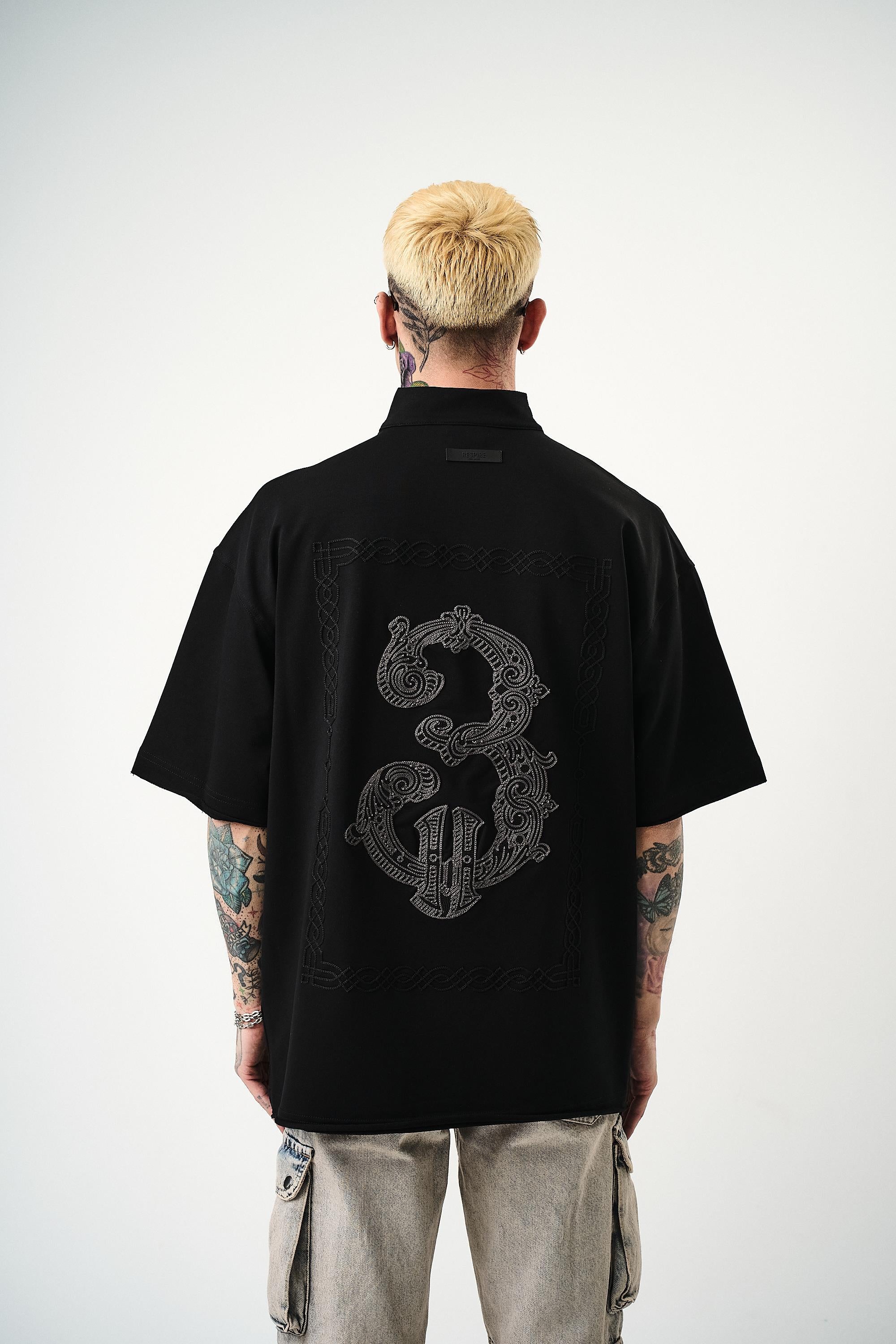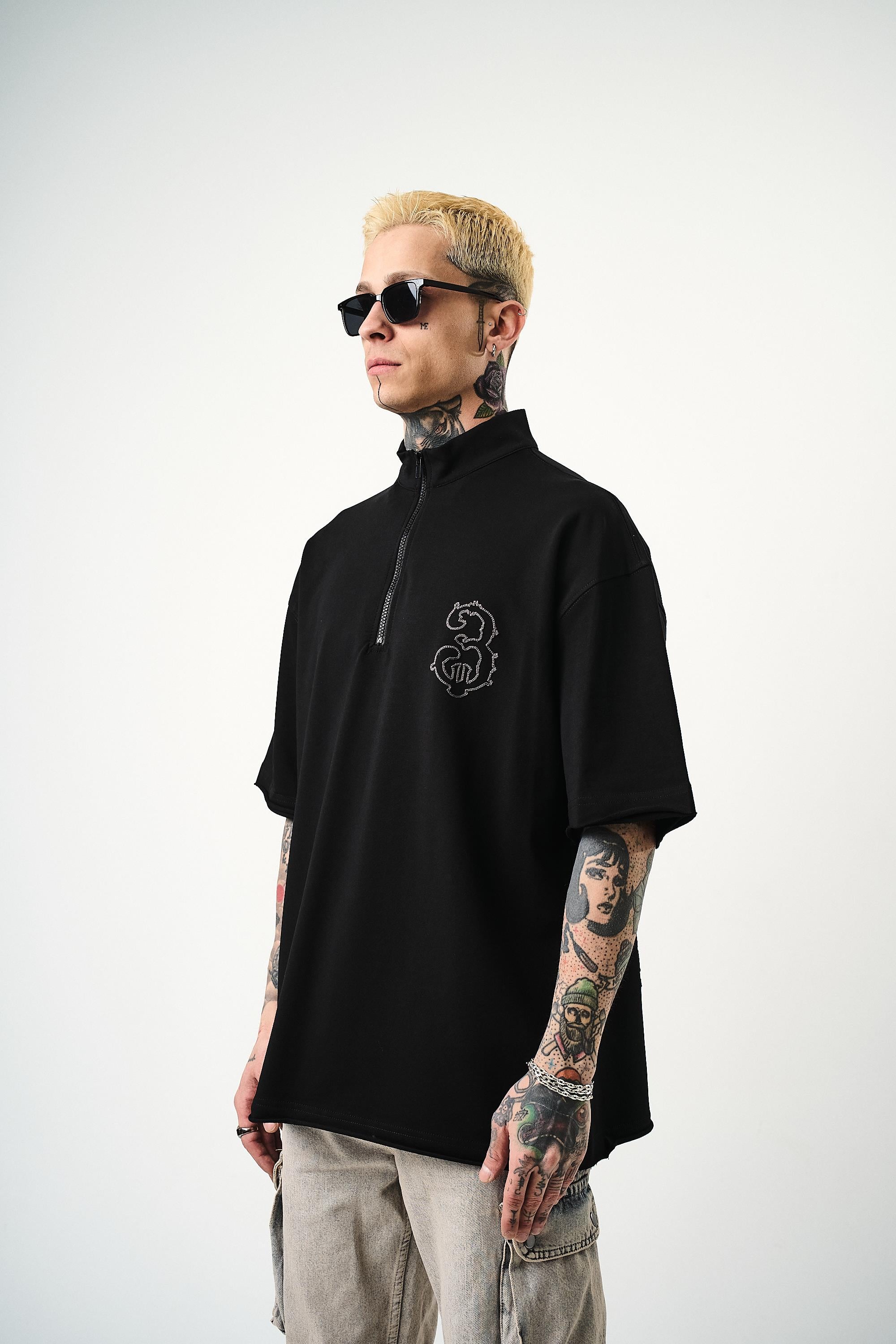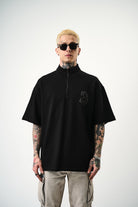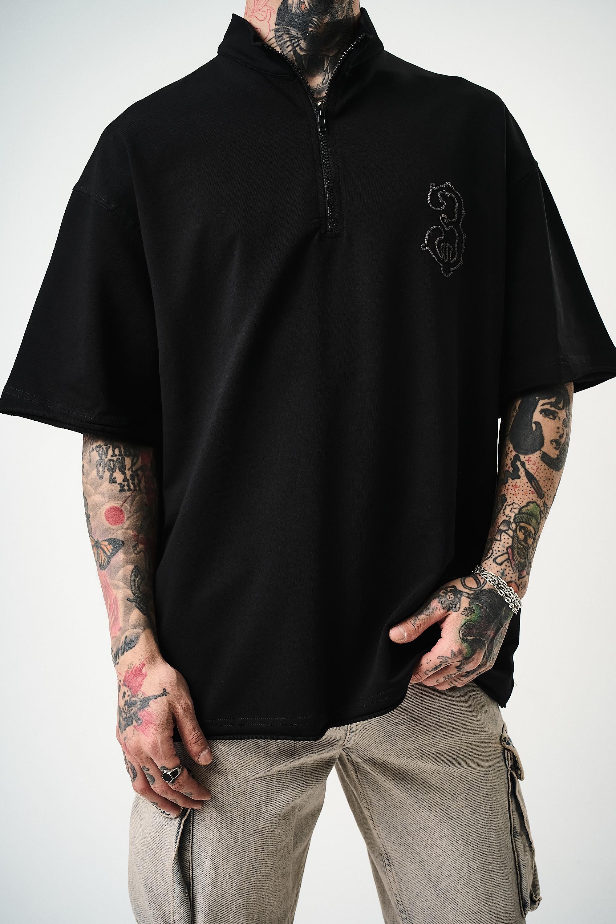 3 Embroidered Half Zip Oversize T-Shirt Black