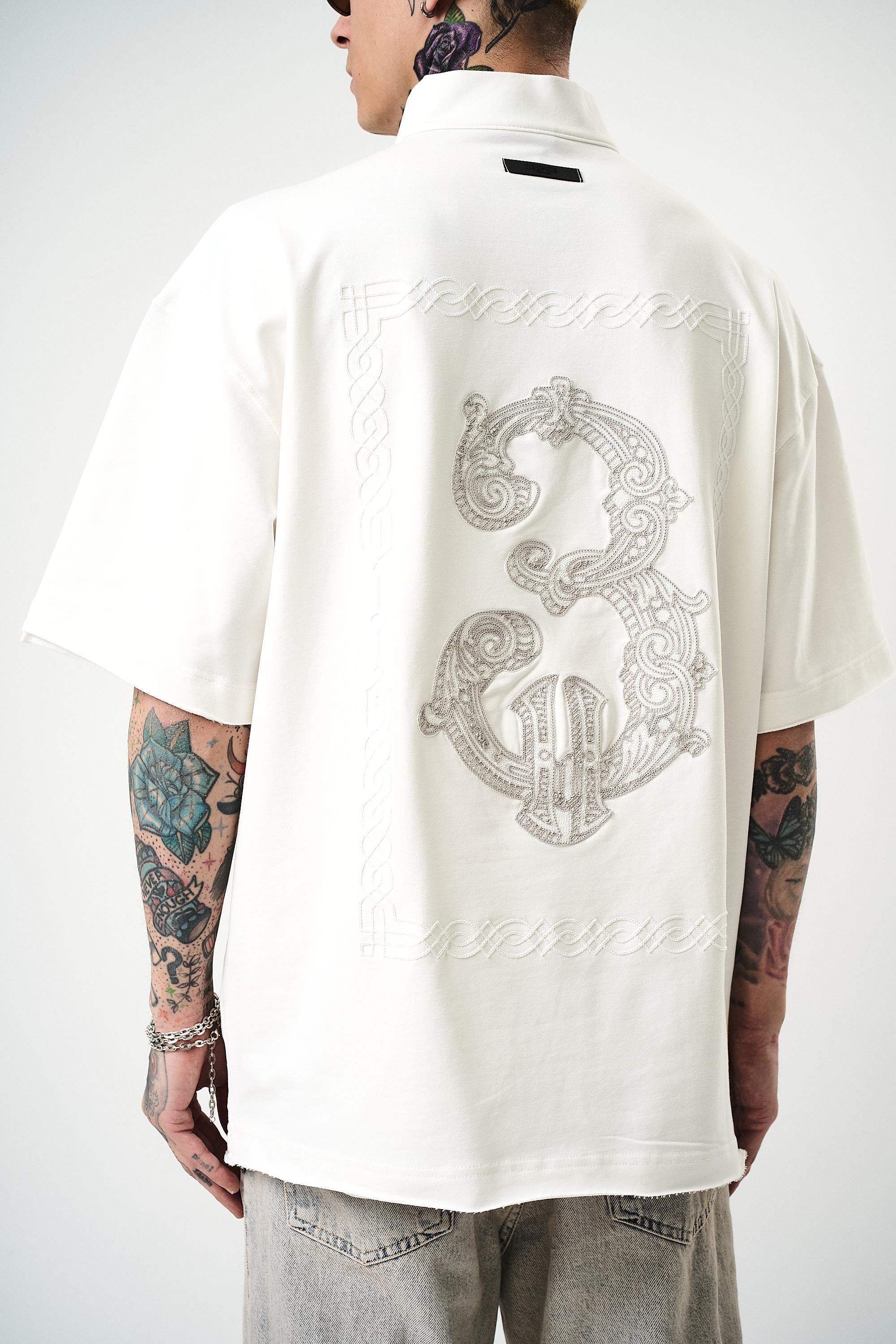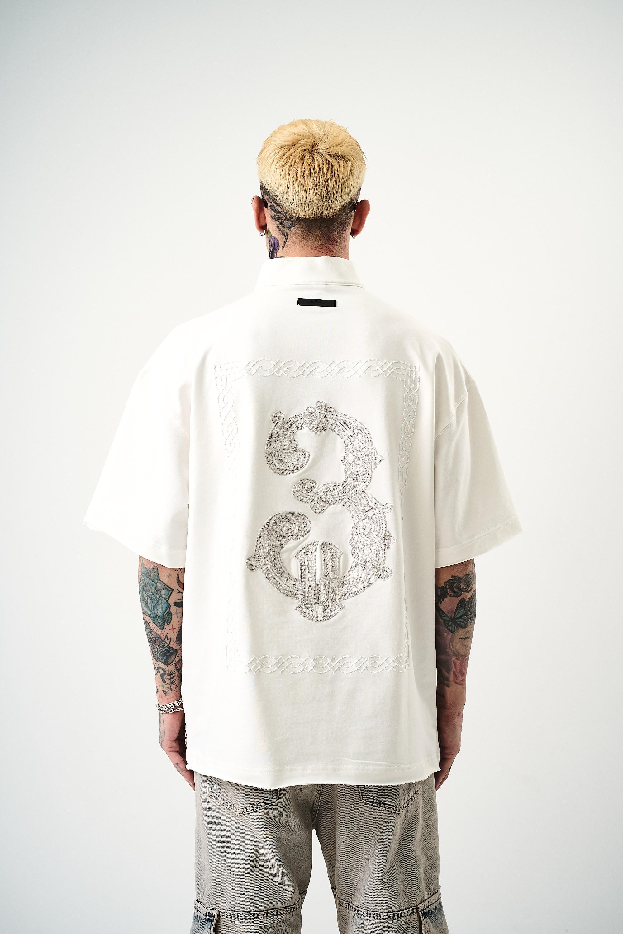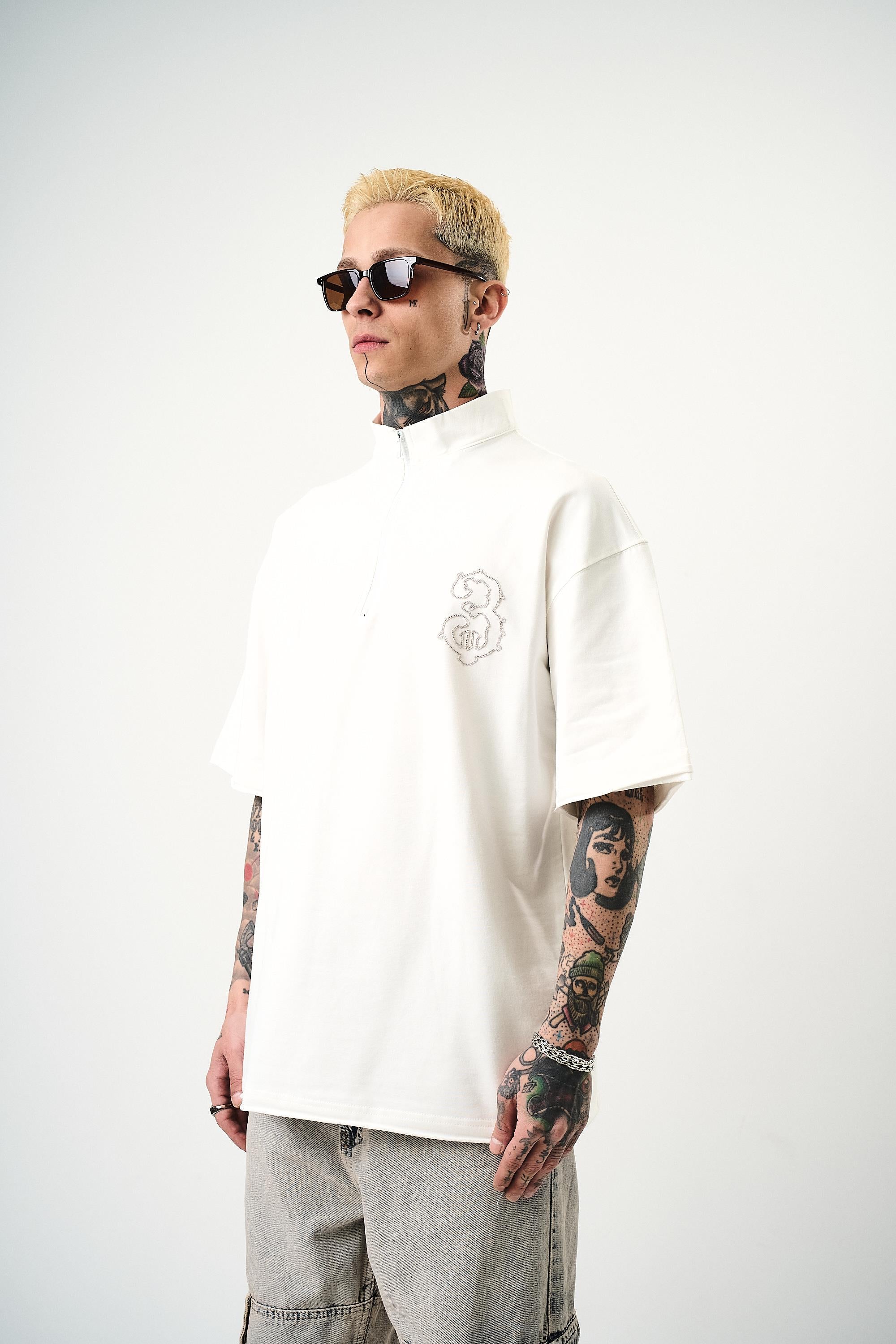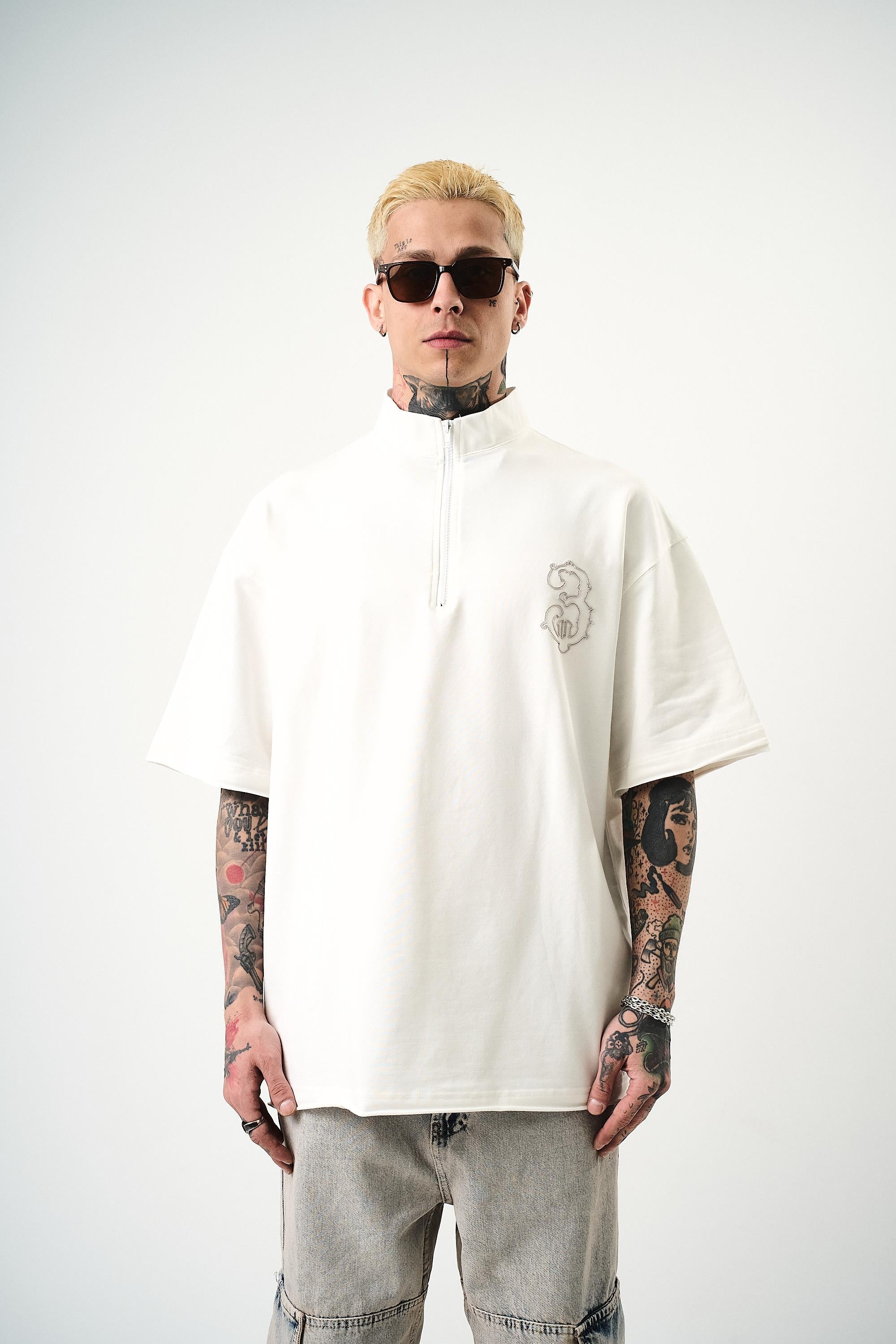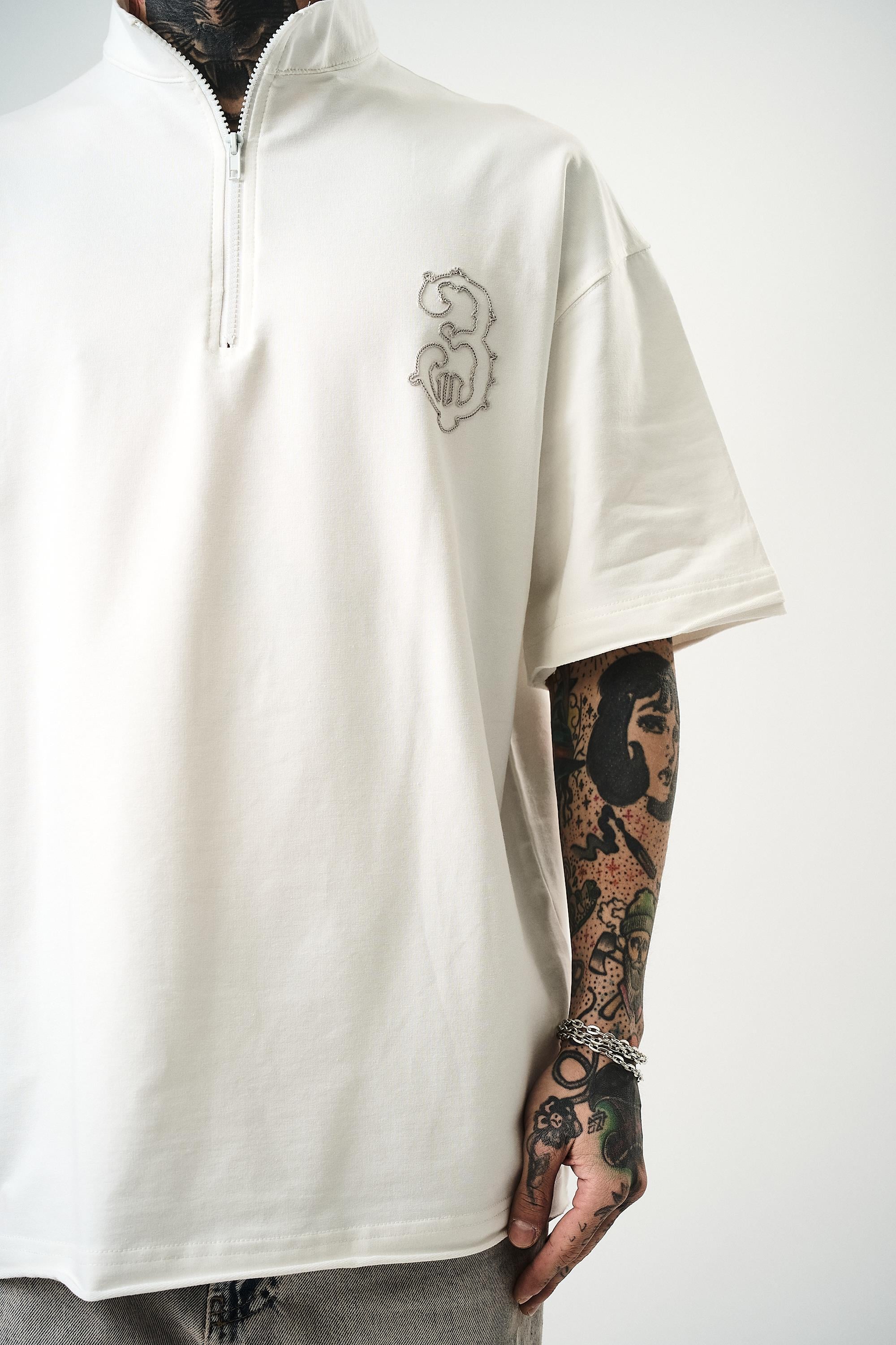 3 Embroidered Half Zip Oversize T-Shirt Ecru