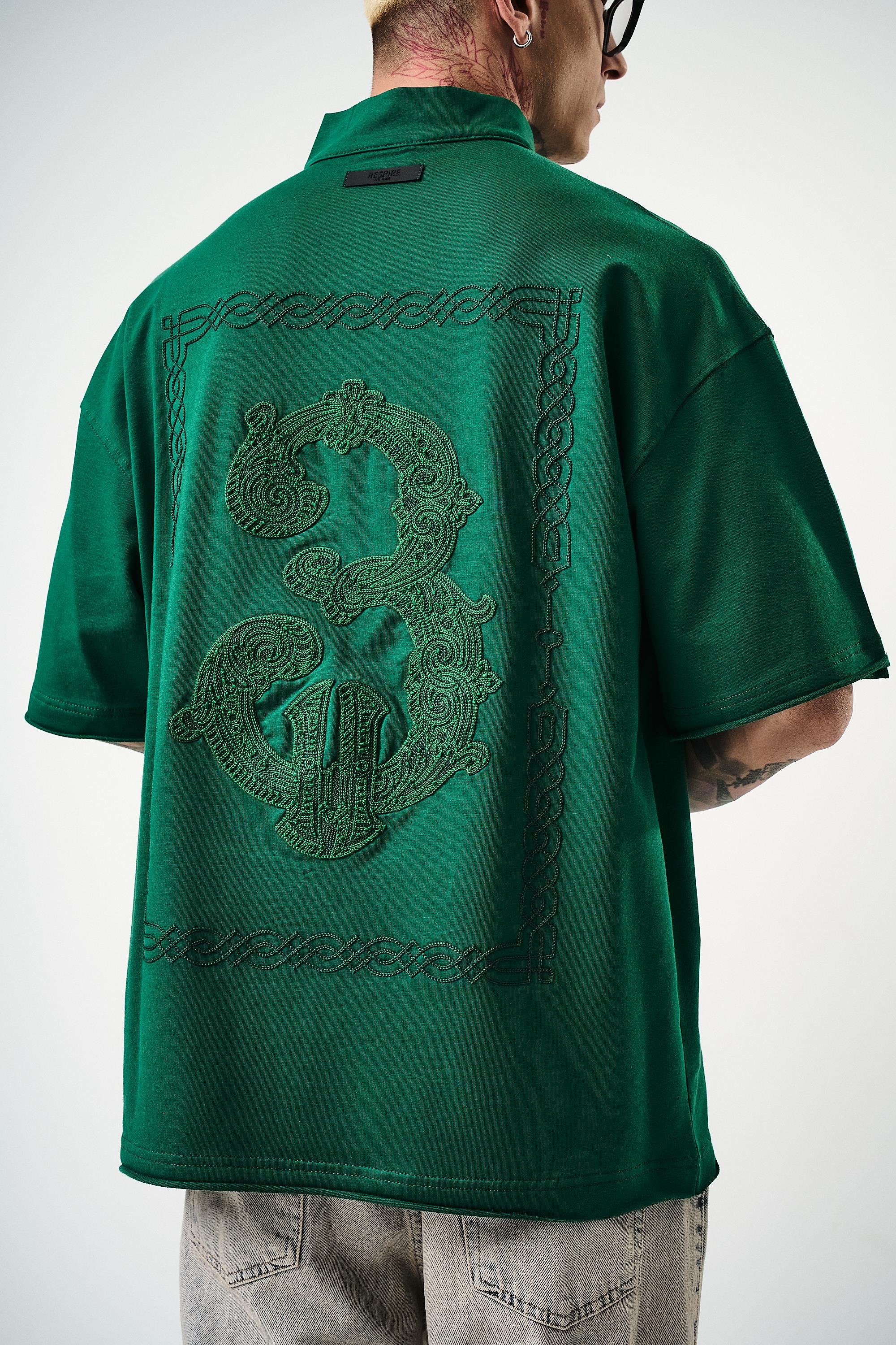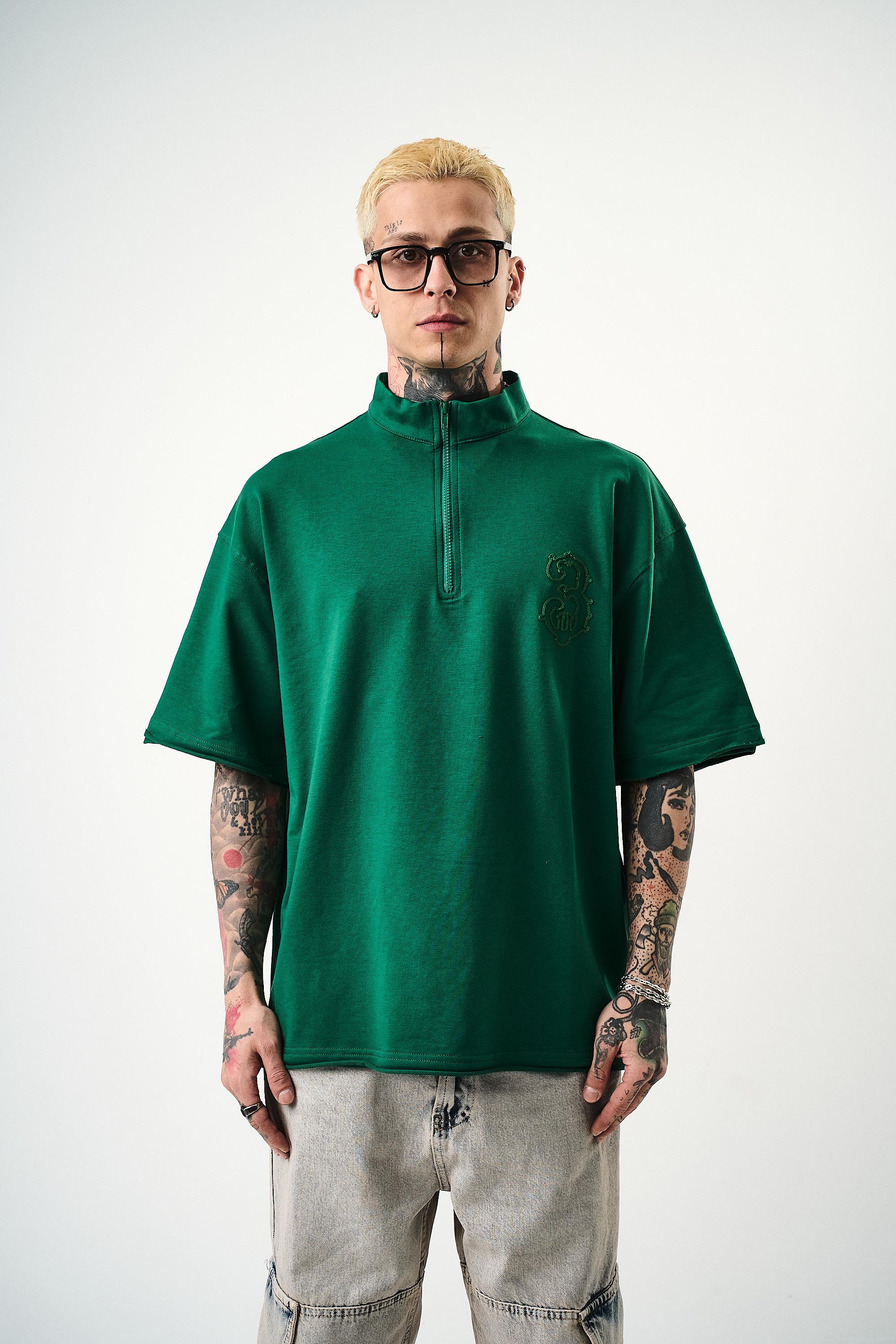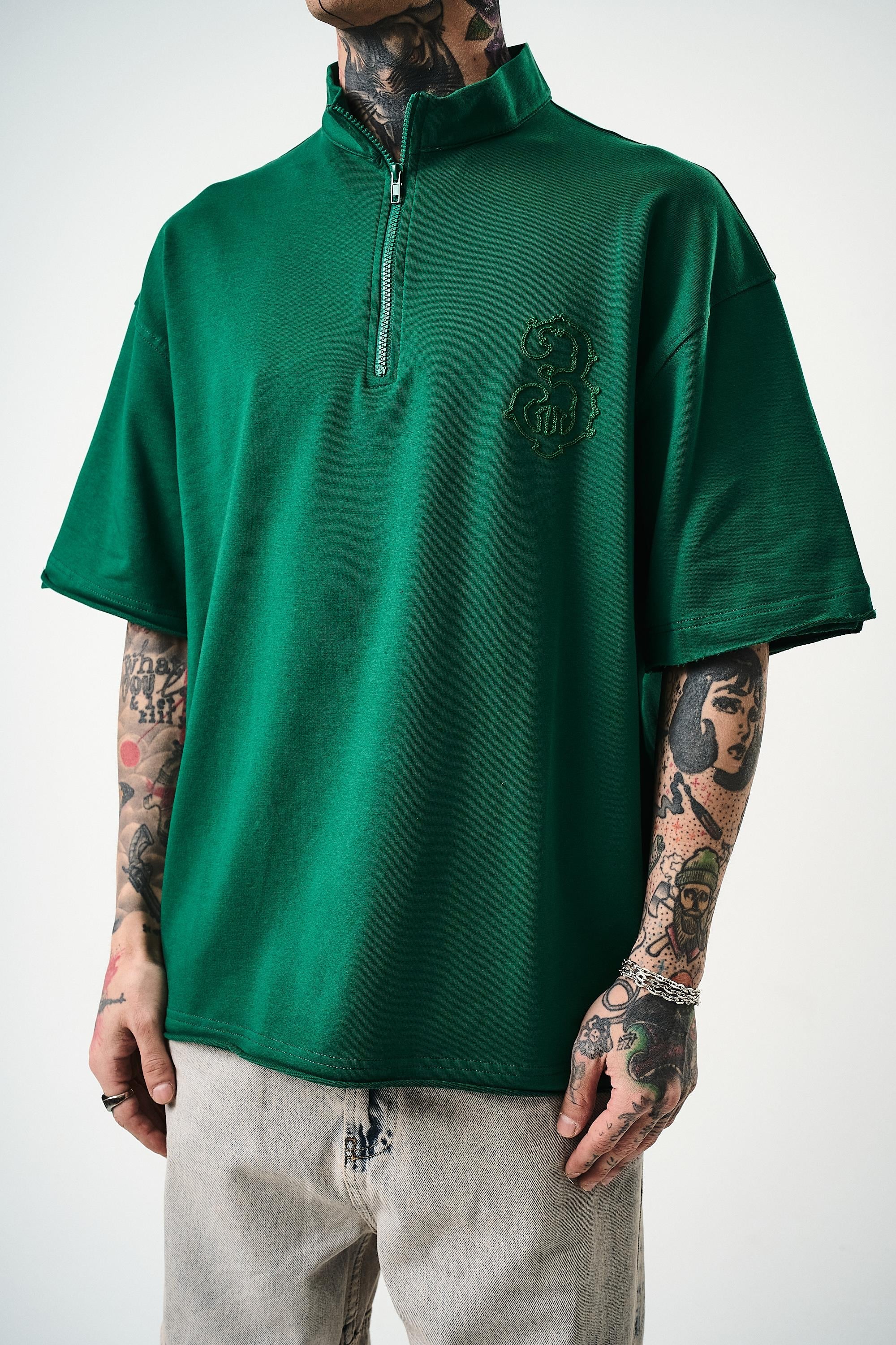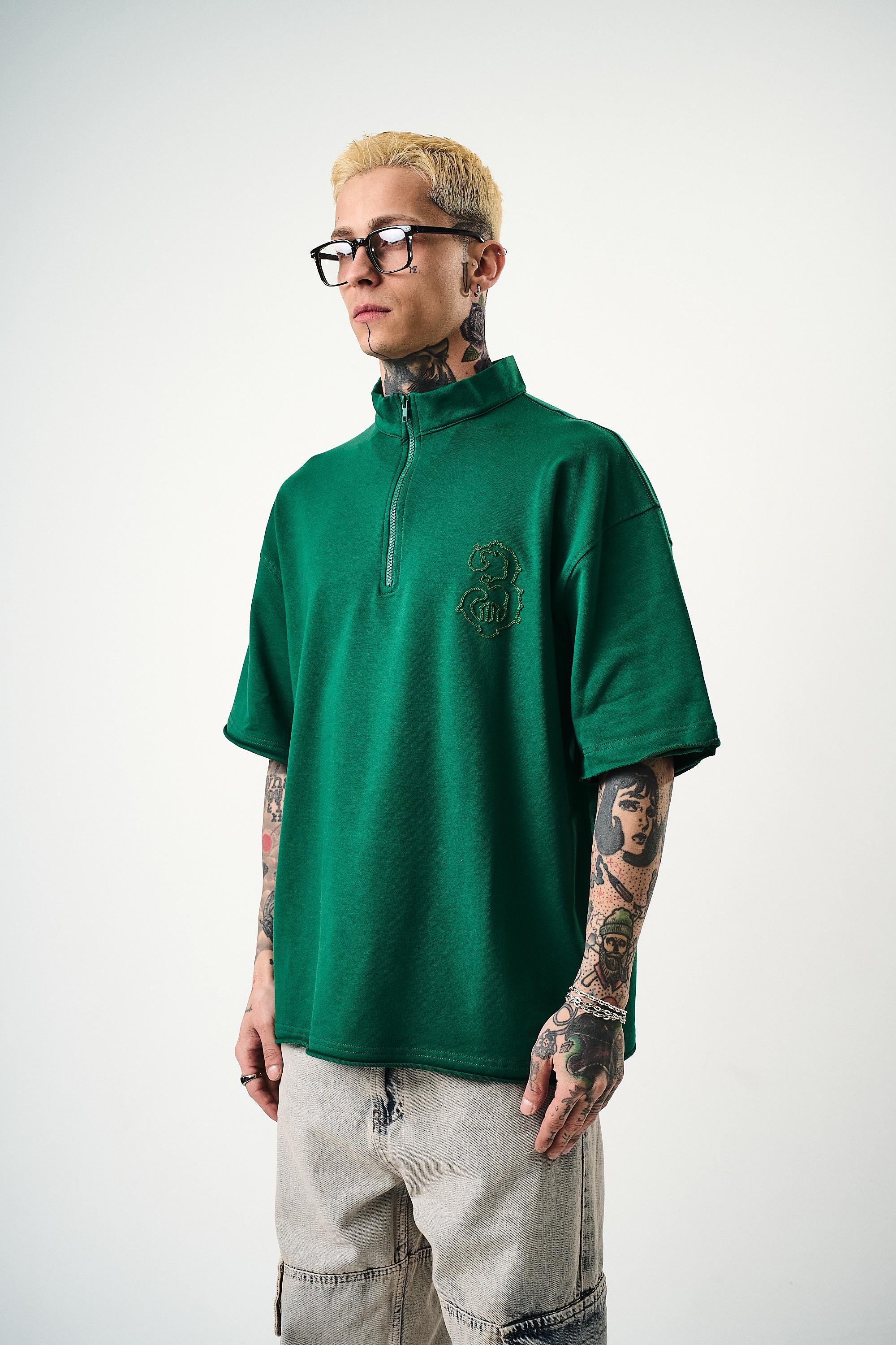 3 Embroidered Half Zip Oversize T-Shirt Petrol Green
